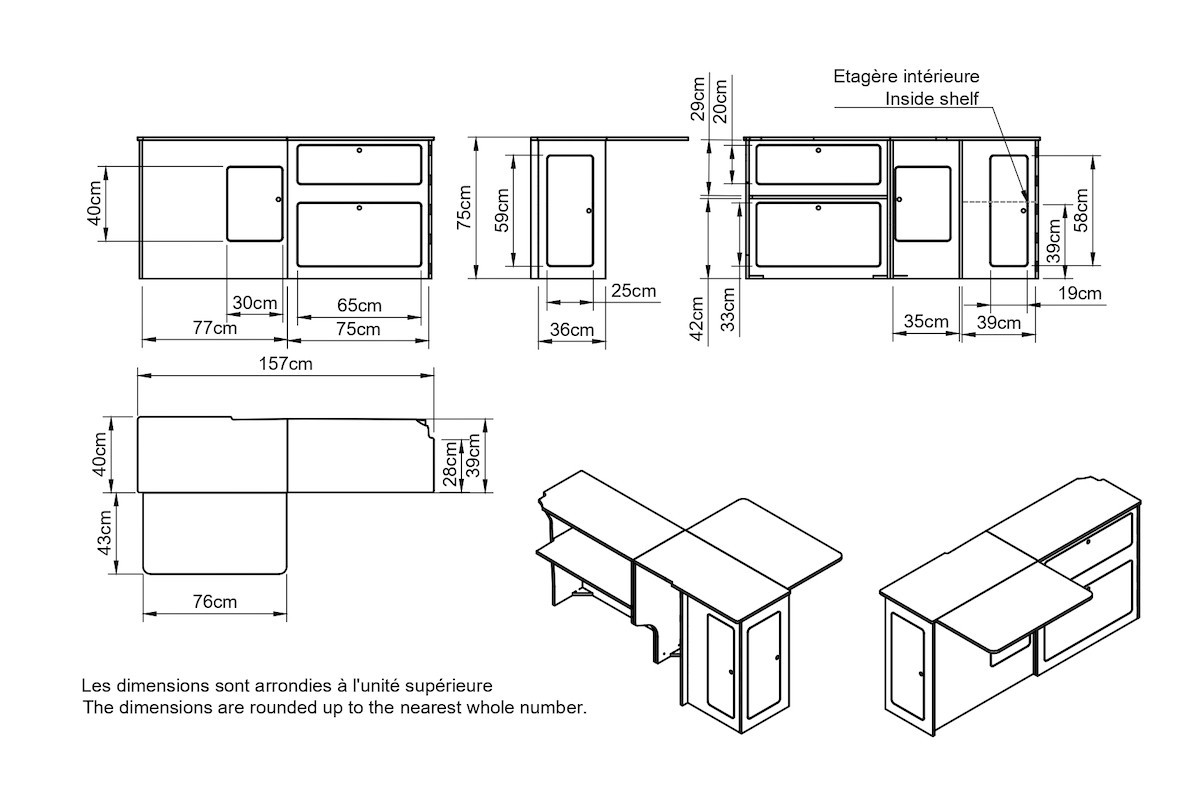 Unsere sorgfältig entworfene Möbeleinheit für Campervans fügt sich nahtlos in den Rest des Innenraums deines Vans ein und optimiert jeden Zentimeter Platz in deinem SWB-Van. Dieses durchdachte Design stellt sicher, dass du über den nötigen Stauraum, Arbeitsbereich und Esskomfort verfügst, um das Beste aus deinen Vanlife-Abenteuern zu machen.