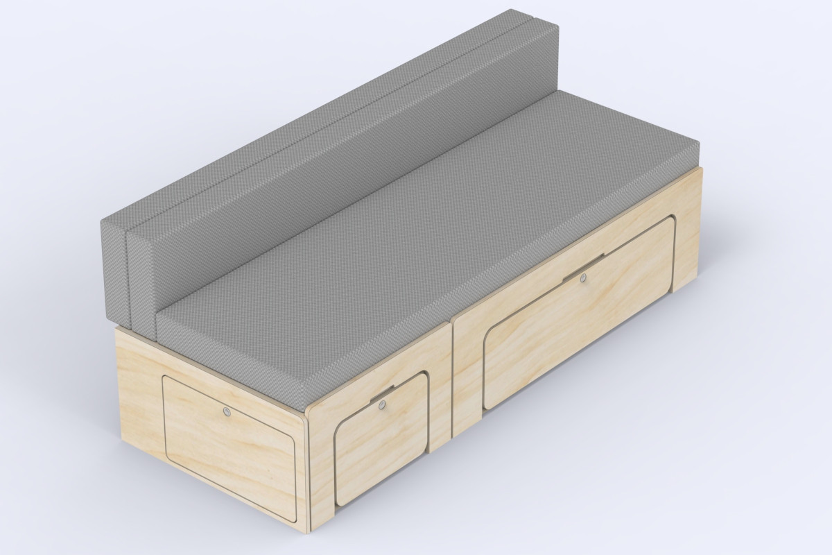 Diese Matratze wurde für Vans wie den VW T5/T6, Renault Trafic und ähnliche Modelle entwickelt und besteht aus zwei durchdachten Elementen. Der erste Teil ist die Rückenlehne. Sie setzt sich aus zwei fest vernähten Schaumstoffstreifen zusammen. Dadurch lässt sie sich sauber zusammenfalten, wenn das Bett im Sitzmodus ist – für eine bequeme, aufrechte Sitzposition am Tag. Abends klappst du sie einfach flach aus, und sie bildet einen Teil deiner gemütlichen Liegefläche. Das zweite Teil ist das Sitzkissen. Es komplettiert das Bett, sobald du es ausklappst, und dient dir tagsüber als angenehme und stabile Sitzfläche. Beide zusammen ermöglichen den Wechsel von Sitzen zu Schlafen in unter 30 Sekunden – sauber, schnell und absolut unkompliziert.