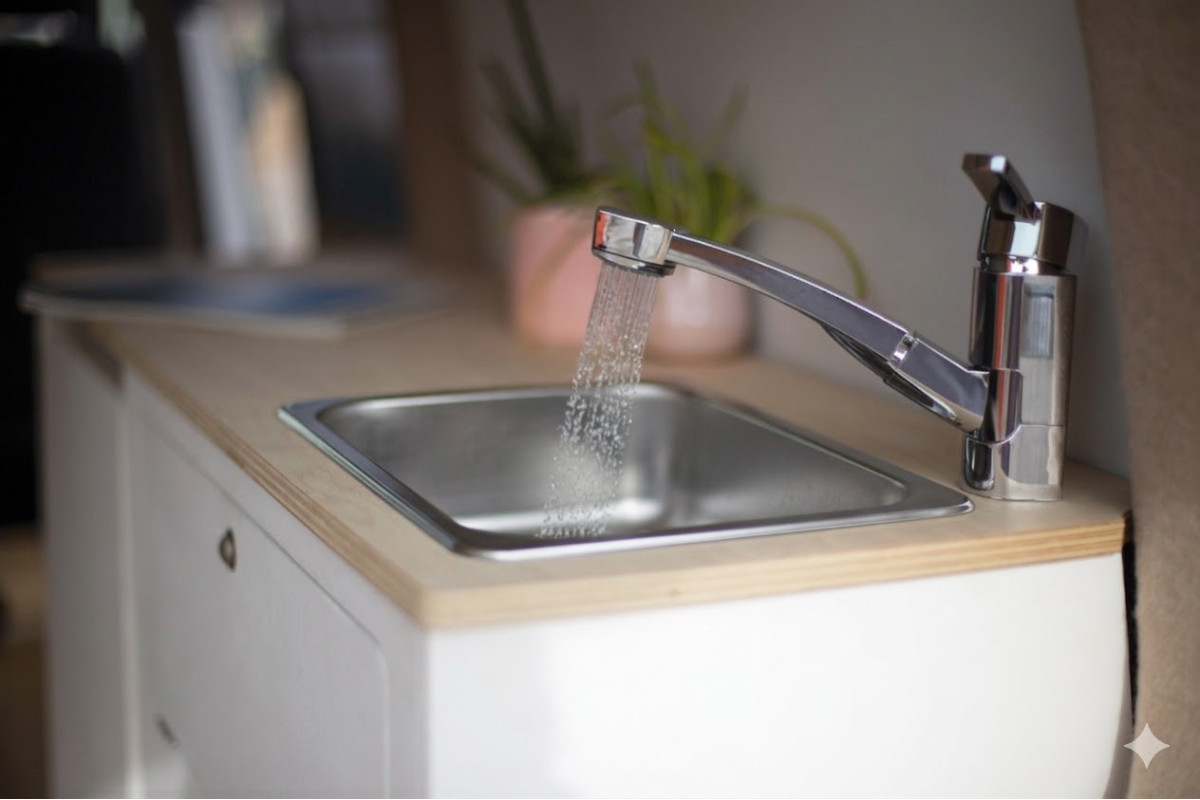 Das Wasserkit mit großem Fassungsvermögen ist für Leute gedacht, die möglichst viel Wasser an Bord haben wollen und eine robuste, klassische Spüle suchen. Es passt ausschließlich zur A4-Seiteneinheit, die in den Roamer- und Nomad-Kits verwendet wird, sowie zu allen Simple-Plus-Layouts. Bei diesem Kit geht’s vor allem um Volumen, Zuverlässigkeit und einfache Handhabung.