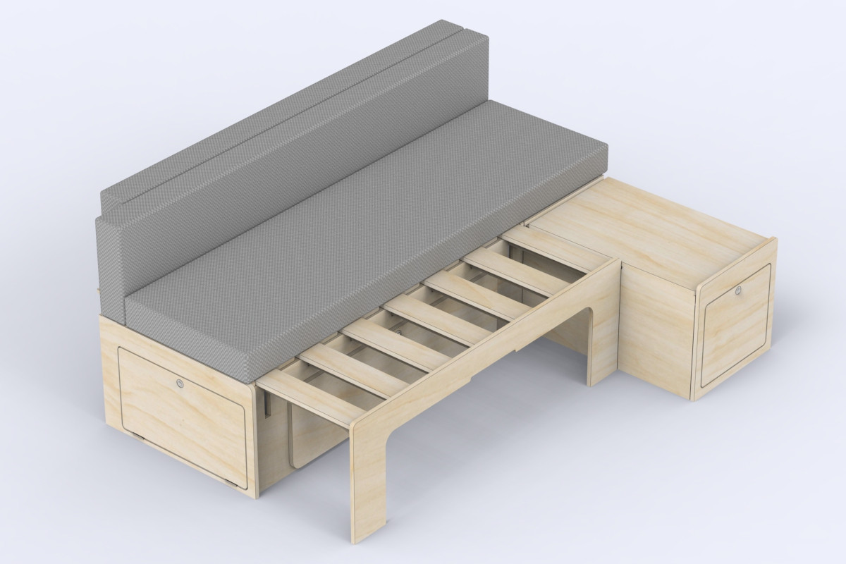 Designed for vans like the Kangoo, Partner, Berlingo, Caddy and similar models, this mattress is built in two carefully engineered parts. The first piece is your backrest section, made from two foam strips sewn together so they fold neatly onto themselves when the bed is in bench mode. This keeps your seating position comfortable and upright during the day – and flips out flat at night to form part of your full sleeping surface. The second piece is the bench-seat cushion, completing the bed when unfolded and giving you a supportive sitting surface when the bed is retracted. Together, they create a clean, quick, easy transition from seating to sleeping in under 30 seconds.