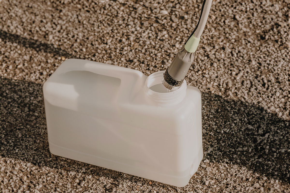 Fill the included 12 L jerrycan, drop in the pump, press the button — instant water flow.