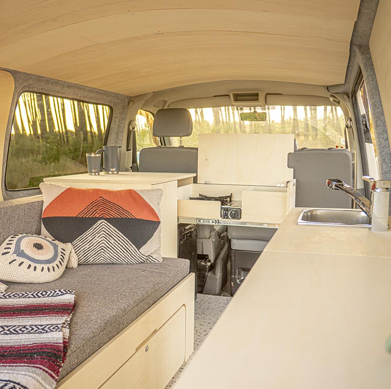Le Legend a été conçu exactement pour ça. Pensé pour les vans L2, il combine notre lit peigne le plus large, un grand meuble latéral et notre grand meuble cuisine avant pour créer un intérieur avec un vrai potentiel de rangement, une cuisine fonctionnelle et tout le confort nécessaire pour les séjours prolongés.