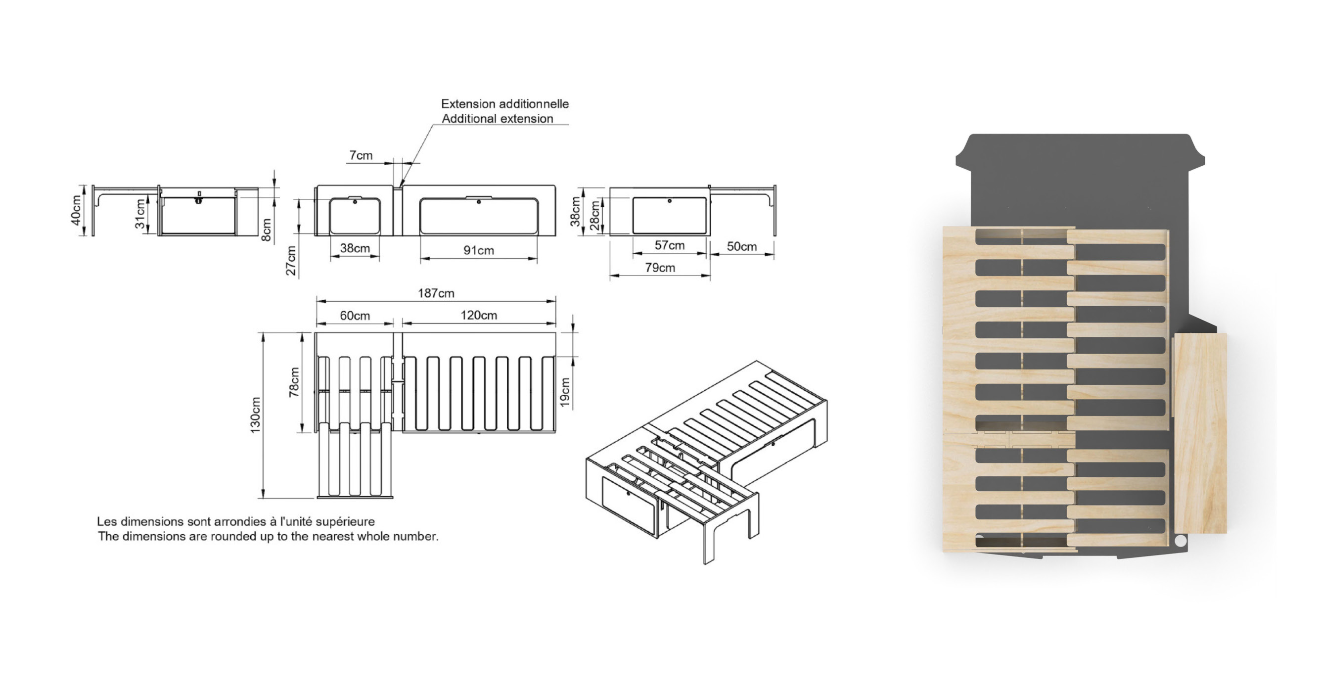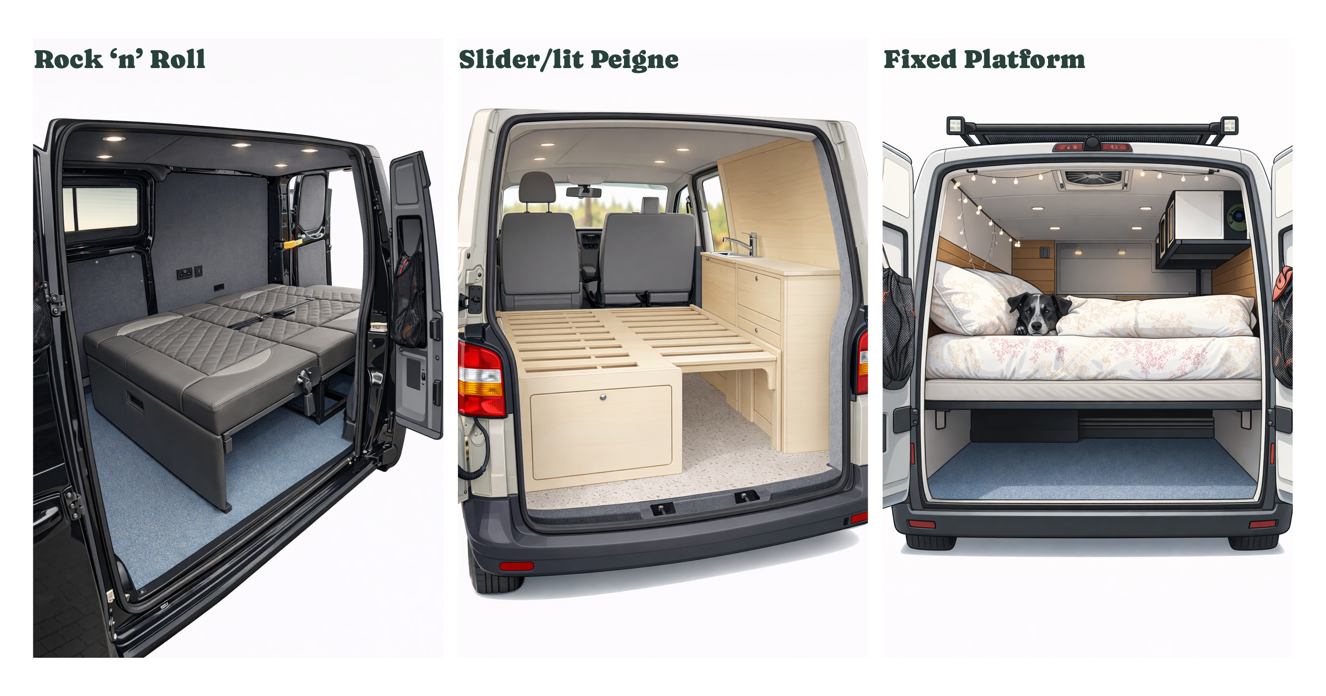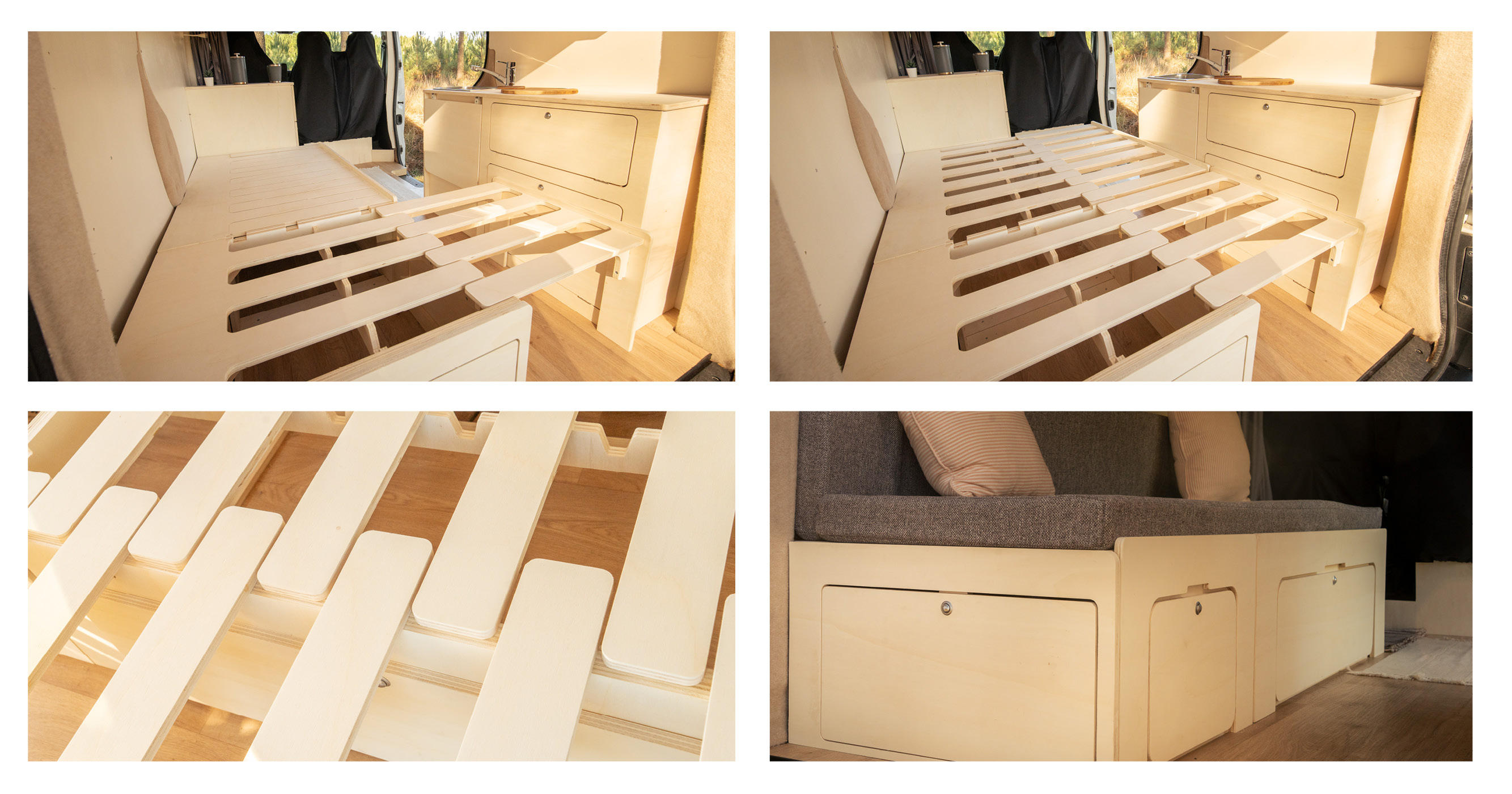 Le bois massif est magnifique et authentique. Il est aussi lourd, sensible aux variations d’humidité, et coûteux aux largeurs qu’exige un lit de fourgon. Quelques détails en bois massif peuvent être superbes. Une plateforme complète en bois massif moins réaliste.