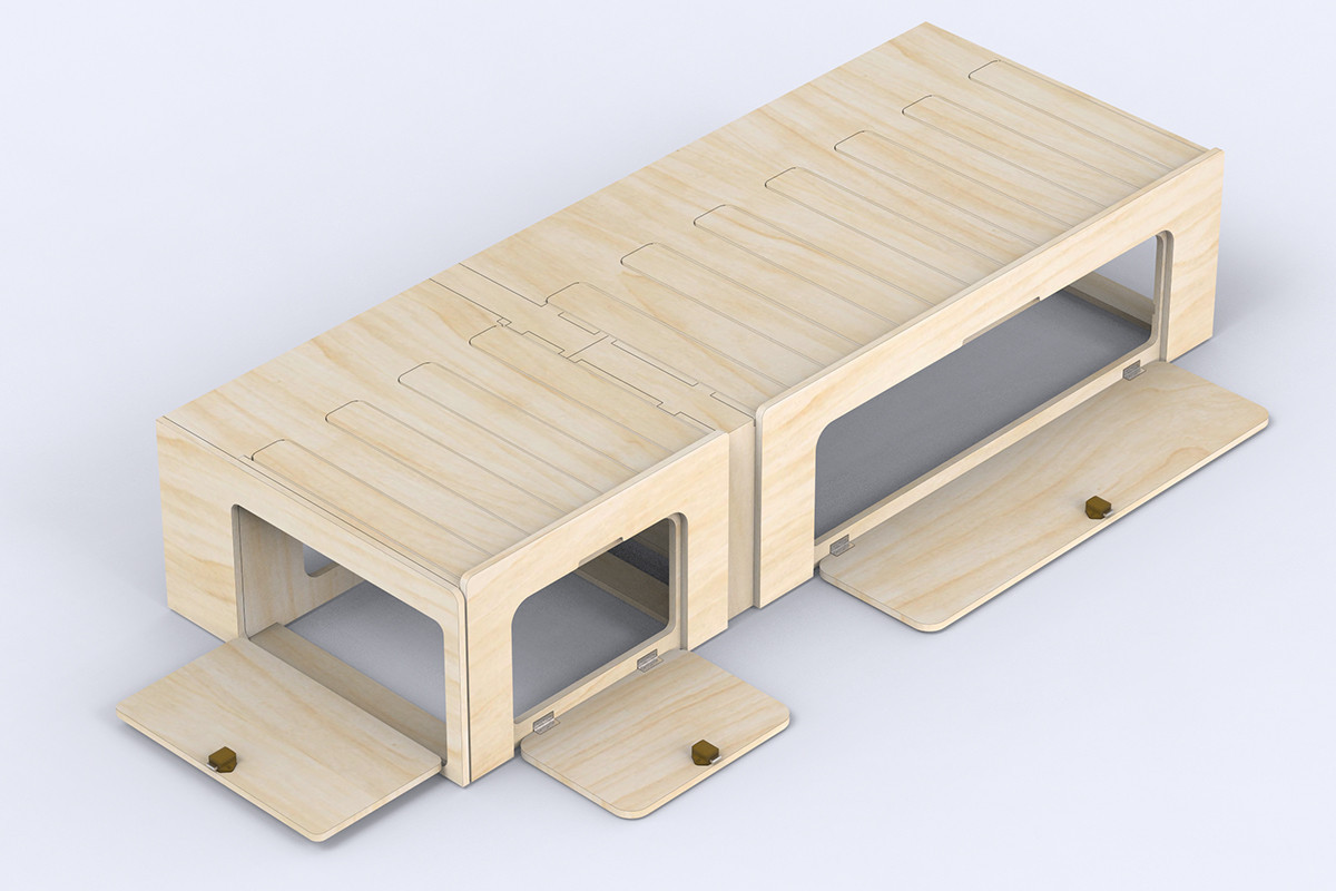Fabriqué en contreplaqué de peuplier ultra-résistant et ultra léger, ce lit peigne se compose de deux sections (60 cm + 120 cm) qui lui permettent d’être utilisé sous trois formats différents – une banquette, un canapé en forme de L qui s’adapte autour d’une table et un confortable lit double de 120 cm de large pouvant supporter jusqu’à 200 kg.