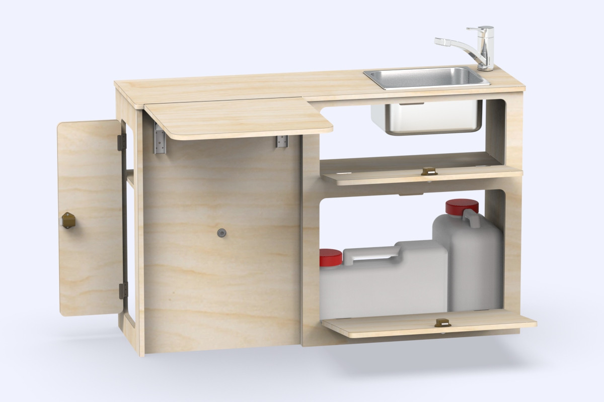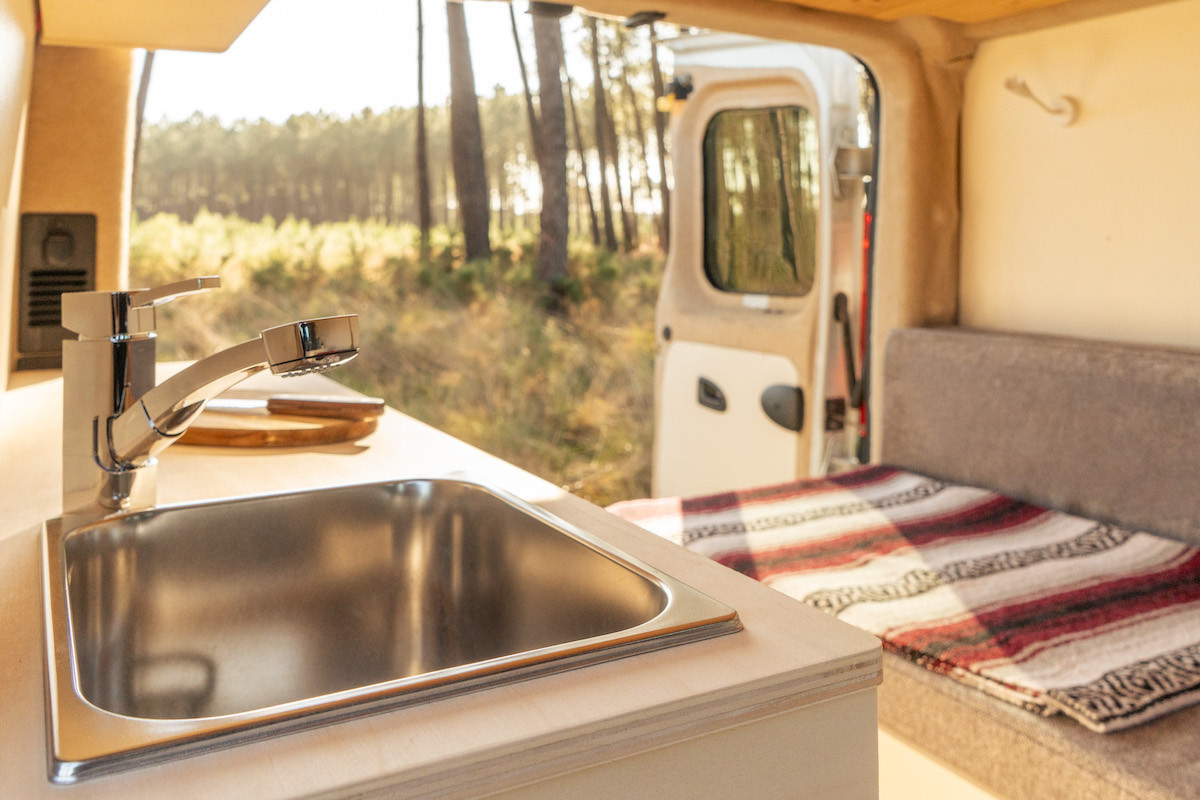 Le système s’intègre harmonieusement dans vos meubles, avec une bassine rectangulaire et une pompe 12 V compacte offrant une pression constante pour un usage quotidien en van.