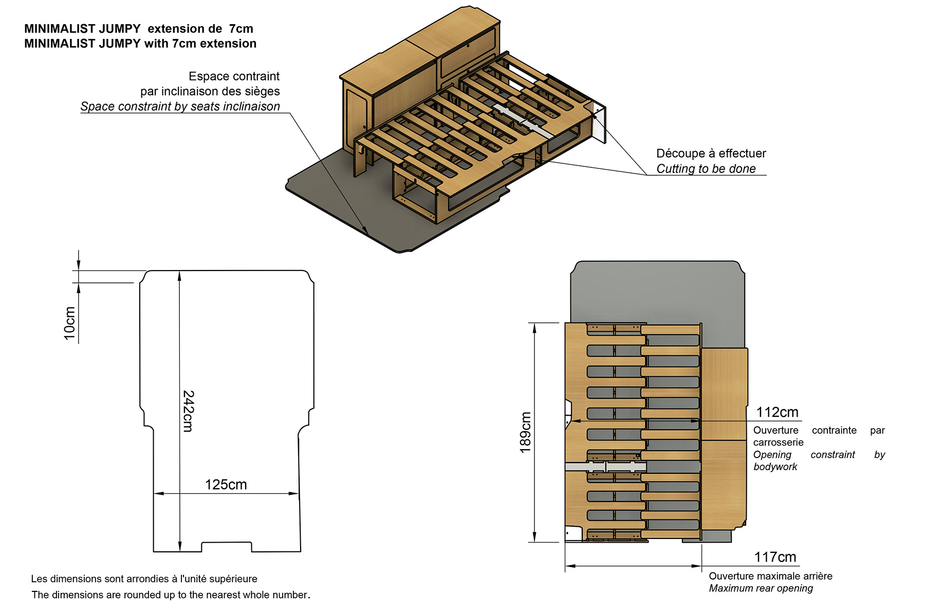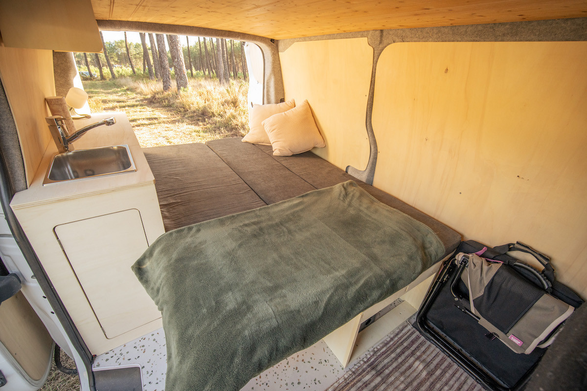 *La longueur et la position du lit peuvent varier selon la configuration intérieure de votre van – notamment la longueur de plancher, la cloison de séparation ou les montants des portes arrière. Dans la plupart des vans, une petite découpe à l’arrière du lit est recommandée pour un ajustement optimal.