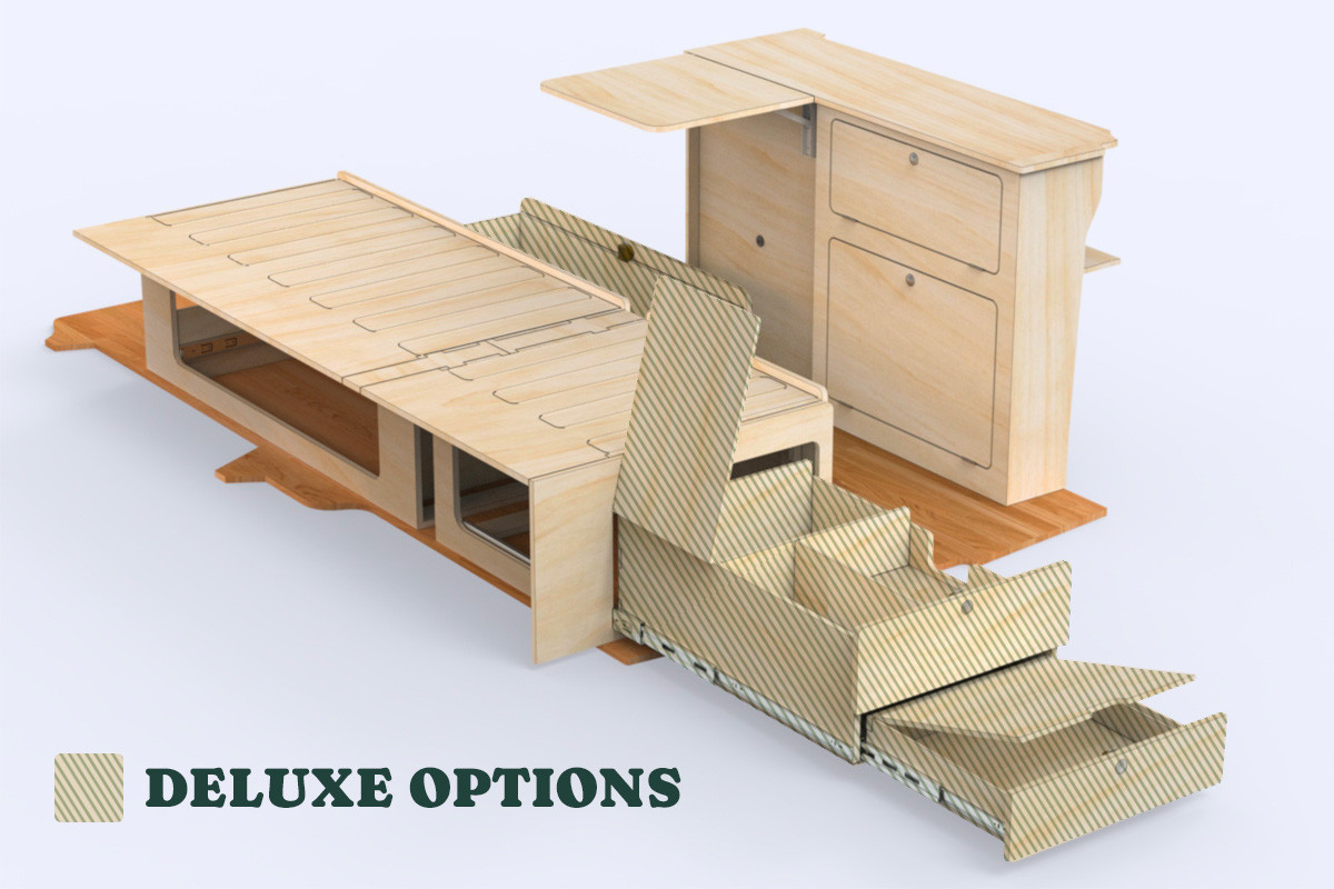 L’ensemble est fabriqué en contreplaqué de peuplier brut, léger et modulaire, que vous pouvez personnaliser comme vous le souhaitez : huile naturelle, vernis résistant ou touche de peinture. Et comme tous les meubles Simple Vans, il est conçu pour être facile à assembler soi-même, à l’aide d’outils de base – solide, fiable et prêt pour des années de voyages.