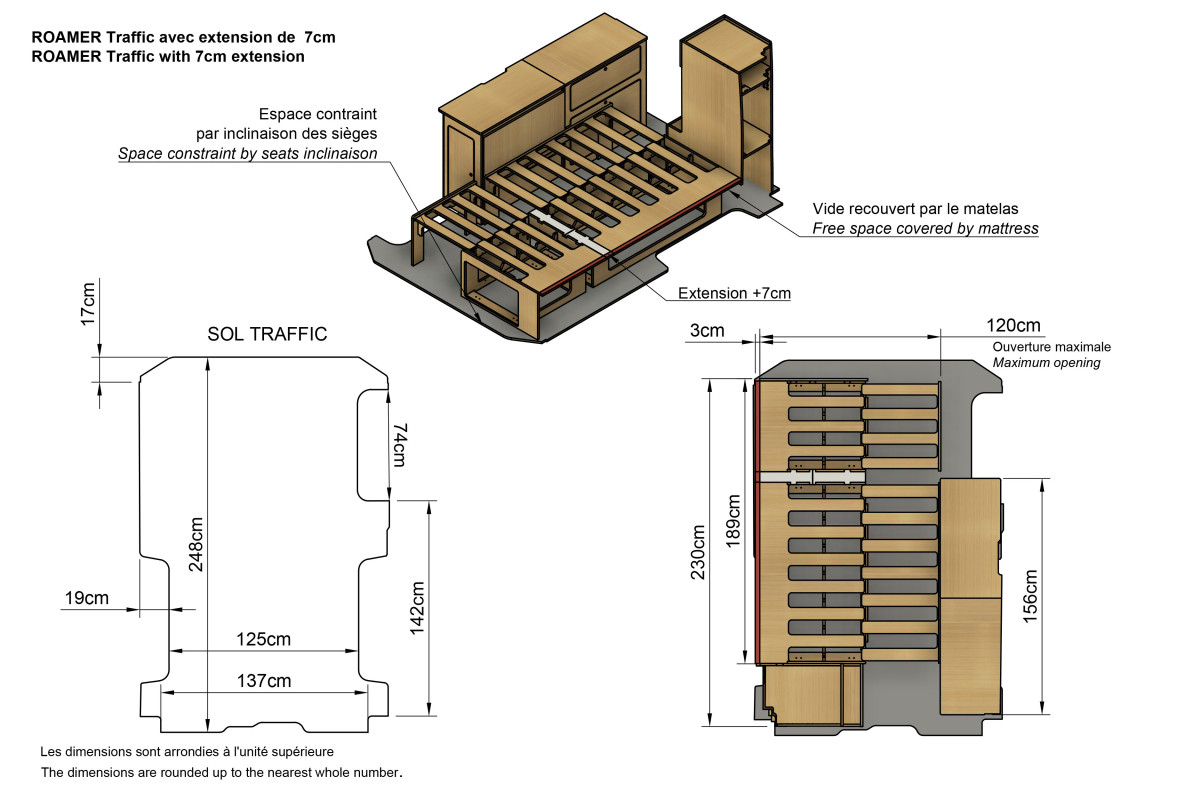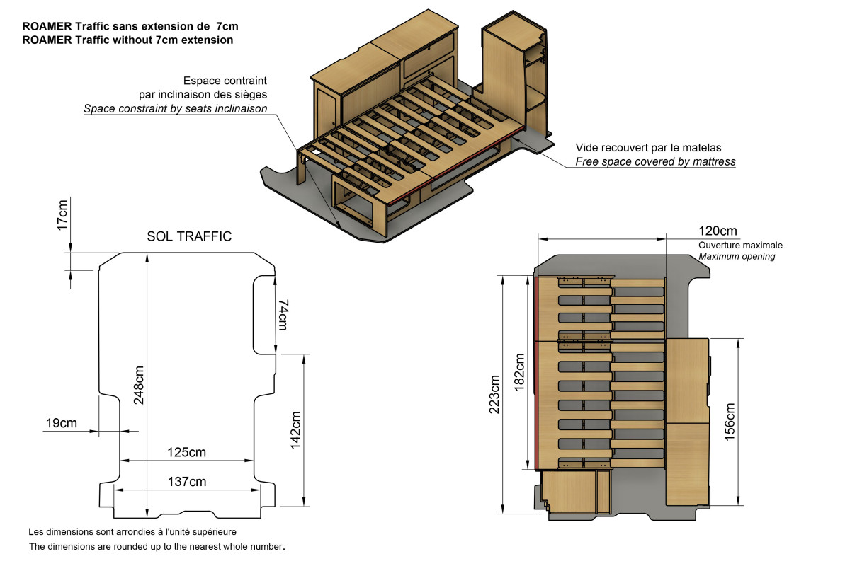 Dans la plupart des vans, une petite découpe à l’arrière du lit est recommandée pour un ajustement parfait.