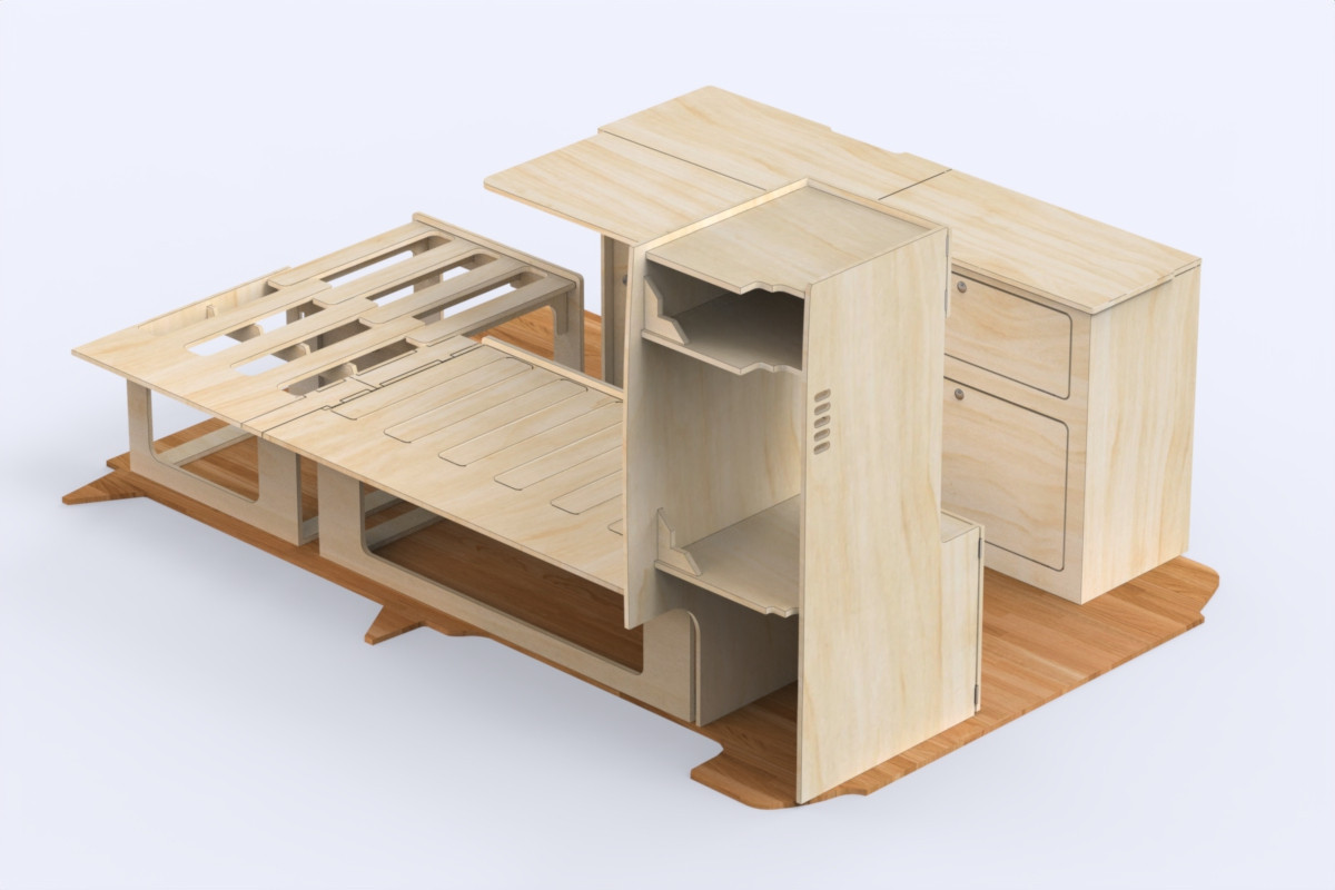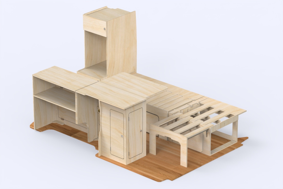 Comme pour tous les meubles Simple Vans, l’ensemble est fabriqué en contreplaqué de peuplier certifié PEFC, léger et modulaire, livré en bois brut prêt à être huilé, verni ou peint selon vos goûts.