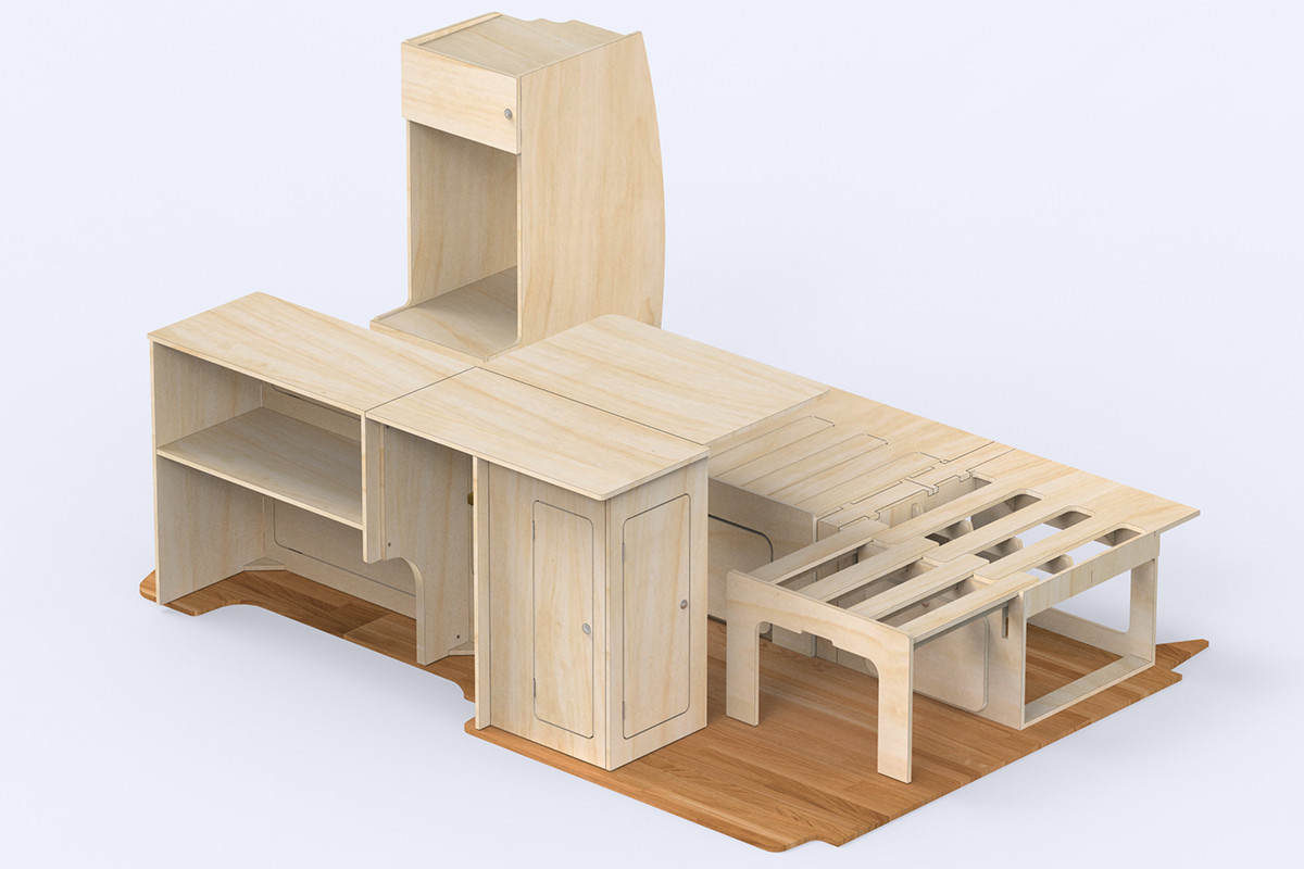 Au centre du kit se trouve le lit coulissant B120, fiable, léger, robuste et ultra-fonctionnel. Il passe du mode banquette au couchage confortable de 112 × 181.5 cm.