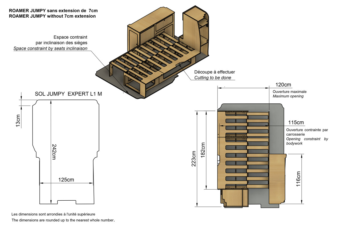 Sous le lit, un large compartiment de rangement accueille votre matériel de camping, vos objets encombrants ou tout l’équipement nécessaire pour les longs séjours.