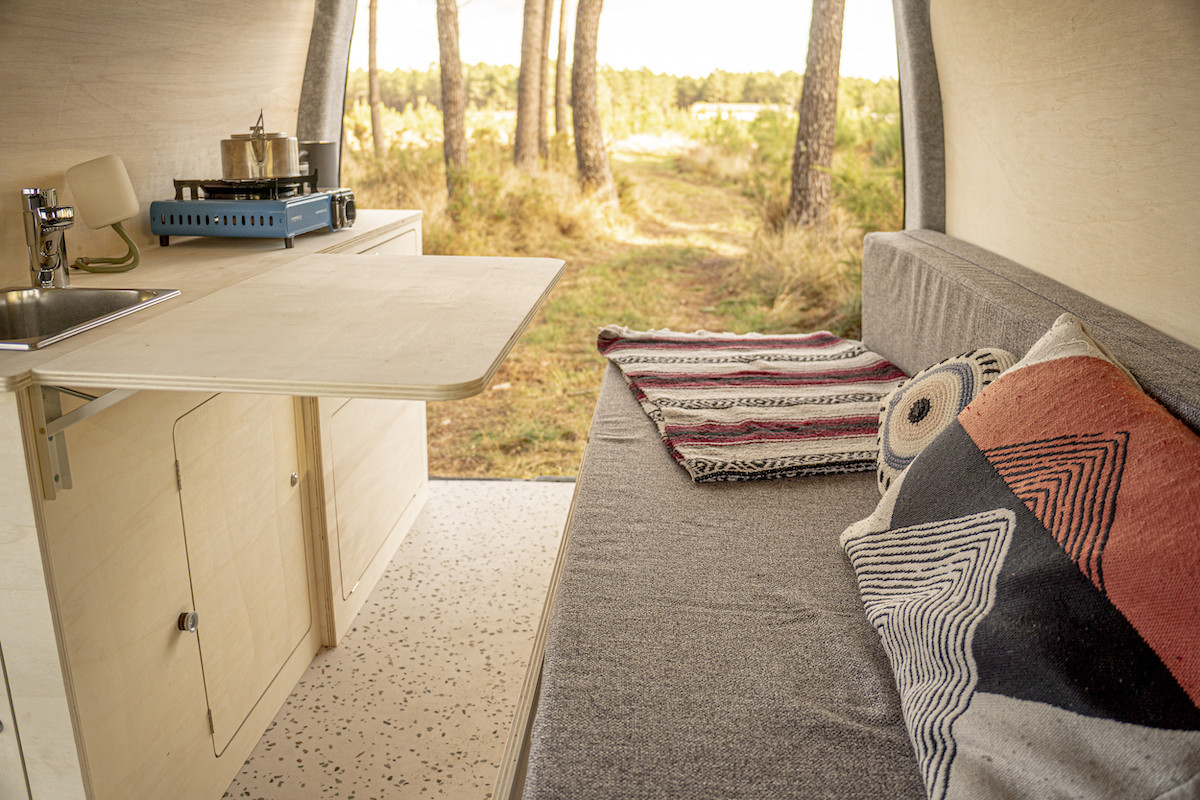 Comme tous les meubles Simple Vans, l’ensemble est fabriqué en contreplaqué de peuplier léger et modulaire, livré en bois brut pour que vous puissiez l’huiler, le vernir ou le peindre selon vos envies.