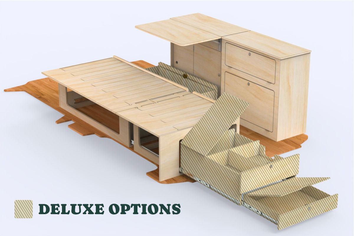 Comme tous les meubles Simple Vans, l’ensemble est fabriqué en contreplaqué de peuplier léger et modulaire, livré en bois brut pour que vous puissiez l’huiler, le vernir ou le peindre selon vos envies.