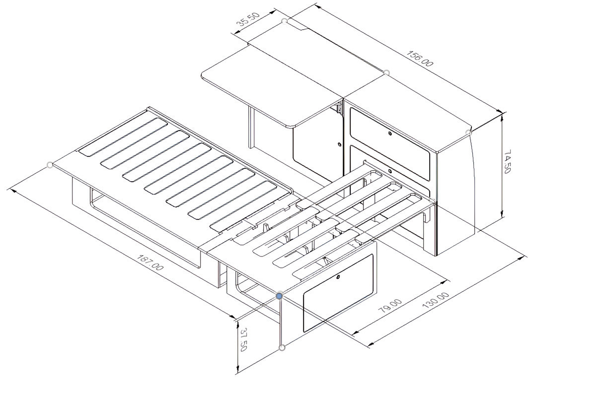 Fabriqué en contreplaqué de peuplier certifié PEFC, léger mais solide, il supporte jusqu’à 200 kg et accueille en dessous un immense espace de rangement – parfait pour le matériel encombrant,vos équipements spéciaux ou tout ce qu’il vous faut pour les voyages longue durée.