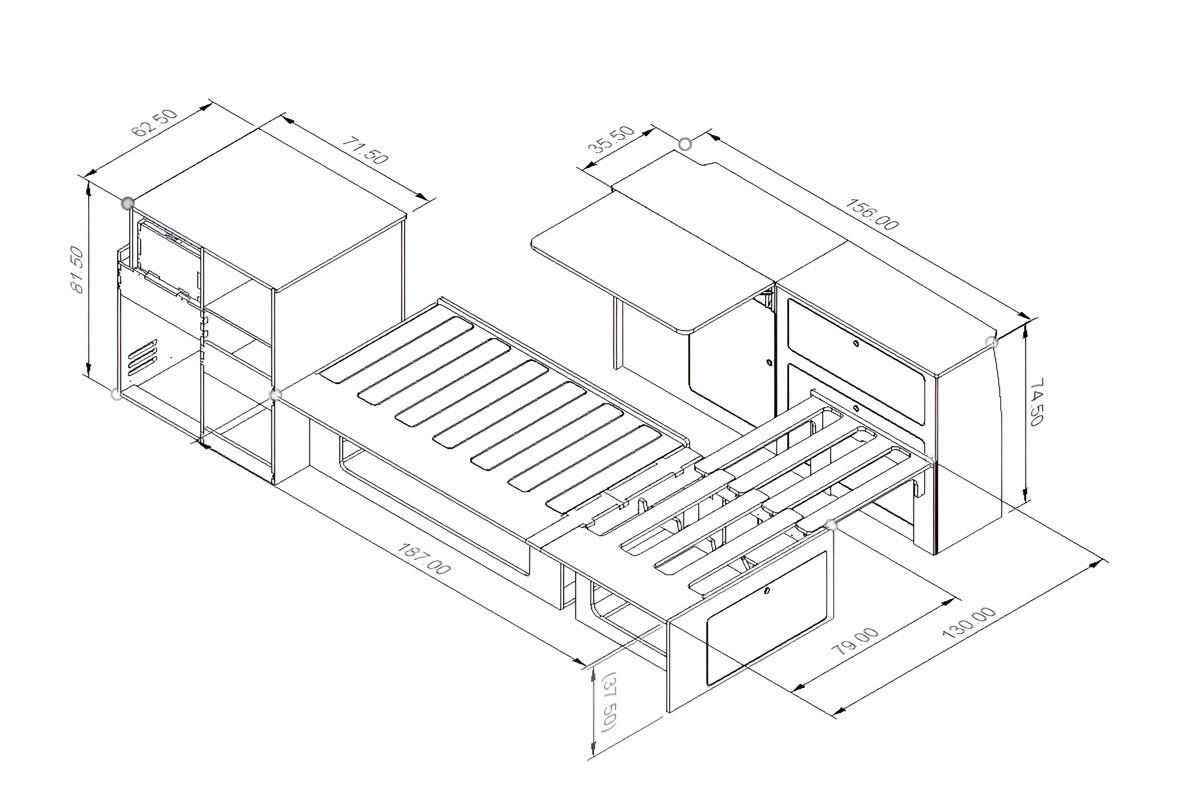 Le soir, il devient un spacieux lit double de 130 × 181.5 cm (jusqu’à 188.5 cm dans de nombreux vans*), fabriqué en contreplaqué de peuplier certifié PEFC, léger et extrêmement solide, supportant jusqu’à 200 kg.