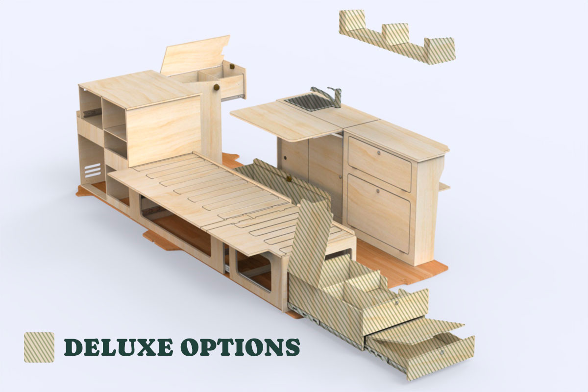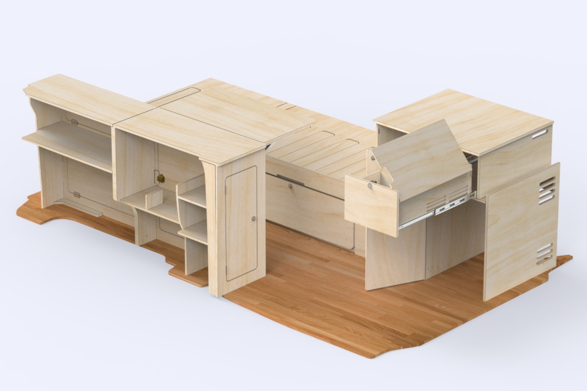Comme tous les meubles Simple Vans, l’ensemble est fabriqué en contreplaqué de peuplier certifié PEFC, léger et modulaire, livré en finition bois brut à huiler, vernir ou peindre selon votre style.