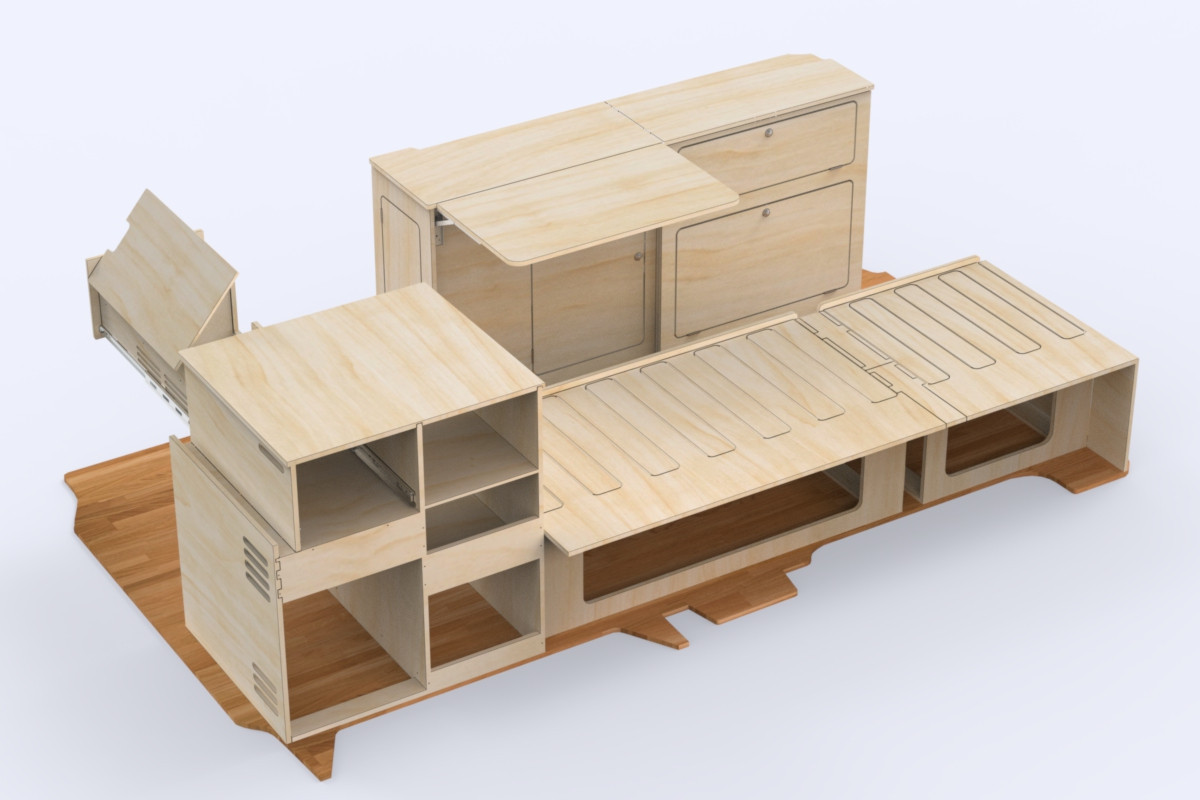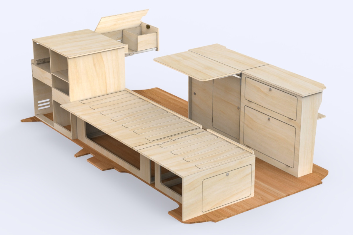 Le Legend a été conçu exactement pour ça. Pensé pour les Peugeot Expert, Citroën Jumpy 3 et similaire (Fiat Scudo, Toyota ProAce) L2, il combine notre lit peigne, un grand meuble latéral et notre grand meuble cuisine avant pour créer un intérieur avec un vrai potentiel de rangement, une capacité de cuisine authentique et tout le confort nécessaire pour les séjours prolongés.