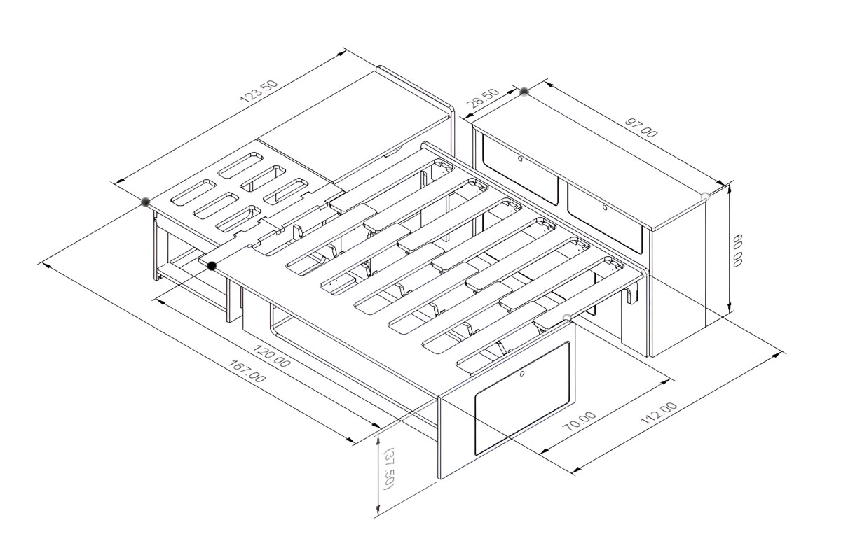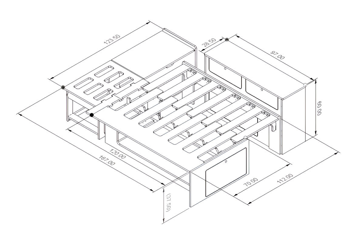 Au cœur du kit se trouve notre lit peigne compact - B4, conçu spécialement pour les petits vans mais étonnamment confortable à l’usage. En mode assise, il devient une banquette en L. Le soir venu, il se déploie en un couchage de 161.5 × 112 cm – assez long pour atteindre 197 cm en diagonale.